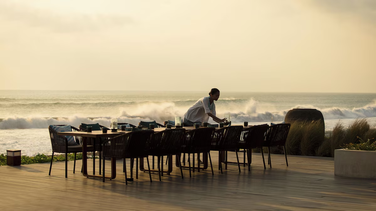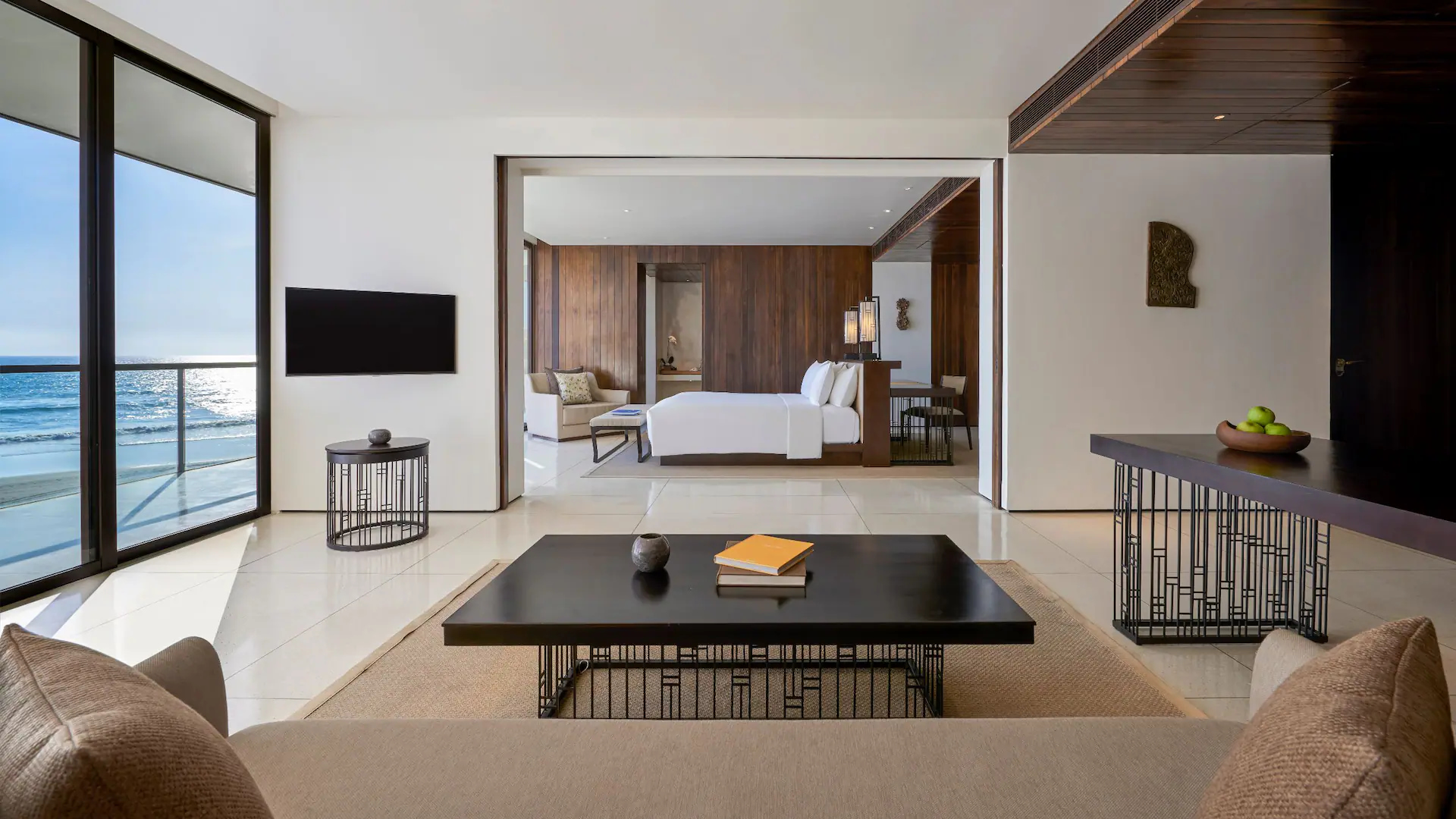 The 176 rooms and suites are arranged in low-slung pavilions that draw the eye to the horizon. Interiors are spare and sculptural, with volcanic stone, recycled timber, and handmade ceramics. The iconic Three-Bedroom Penthouse boasts panoramic ocean views, a private infinity pool, and dining for ten – ideal for groups or celebrations in absolute privacy.