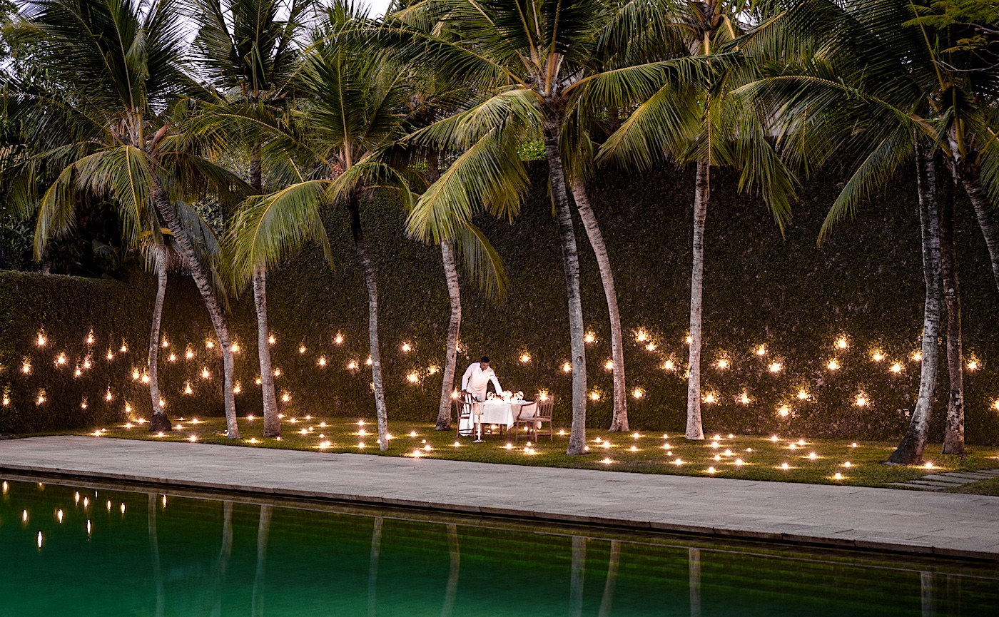 - Shaded pool surrounded by mature palms and tranquil gardens