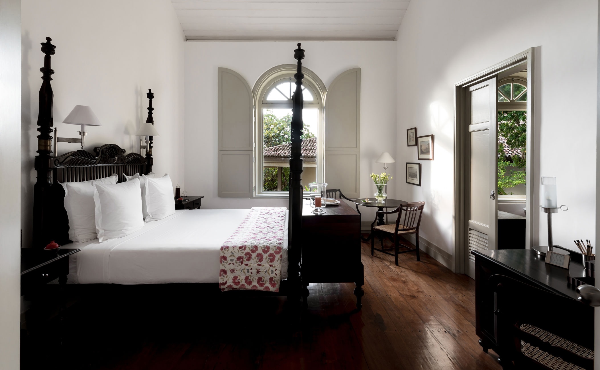 Rooms and suites, known as chambers, blend heritage charm with understated luxury – four-poster beds draped in crisp linen, freestanding bathtubs, shuttered windows and views across the fort or the red-tiled rooftops towards the harbour. Courtyards shaded by frangipani trees and the elegant verandah invite slow moments of calm, while the library and drawing rooms evoke the romance of a bygone era.