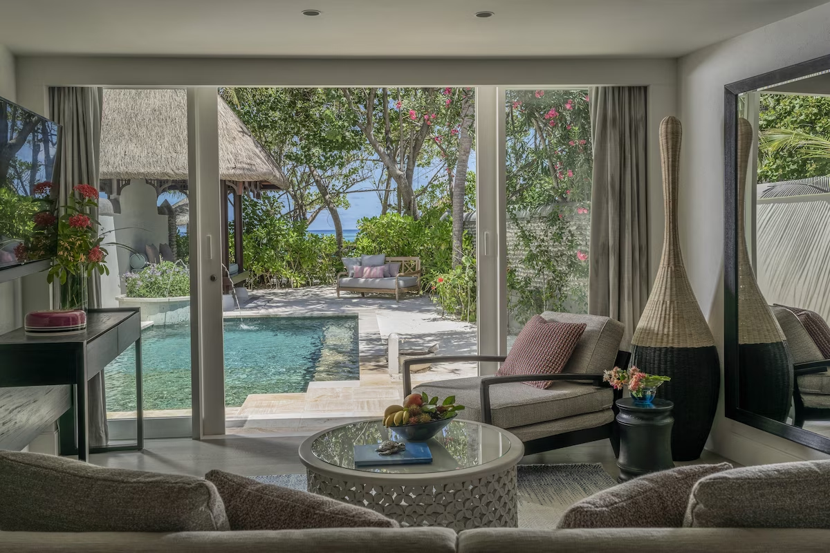 Accommodation ranges from beachfront pavilions with private pools to expansive overwater suites where sunrise yoga and sunset lounging feel part of daily life. Villas are decorated in warm timbers, whitewashed furnishings and traditional coral stone, offering a sense of calm and authenticity. The lagoon-facing infinity pool and floating hammocks create ideal spots for relaxing under the tropical sun.