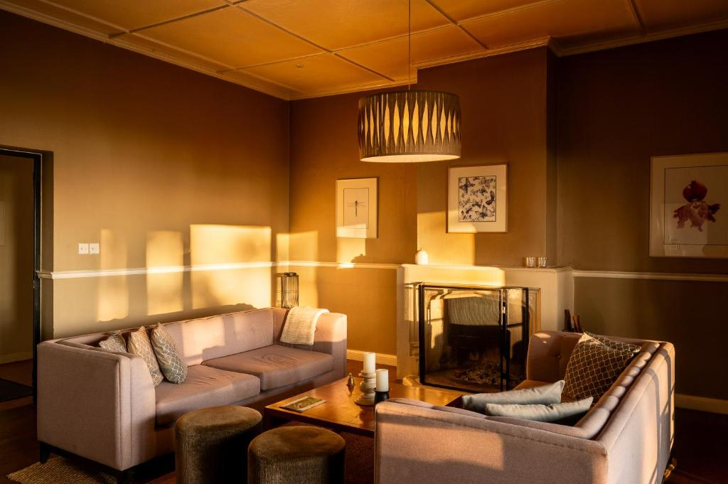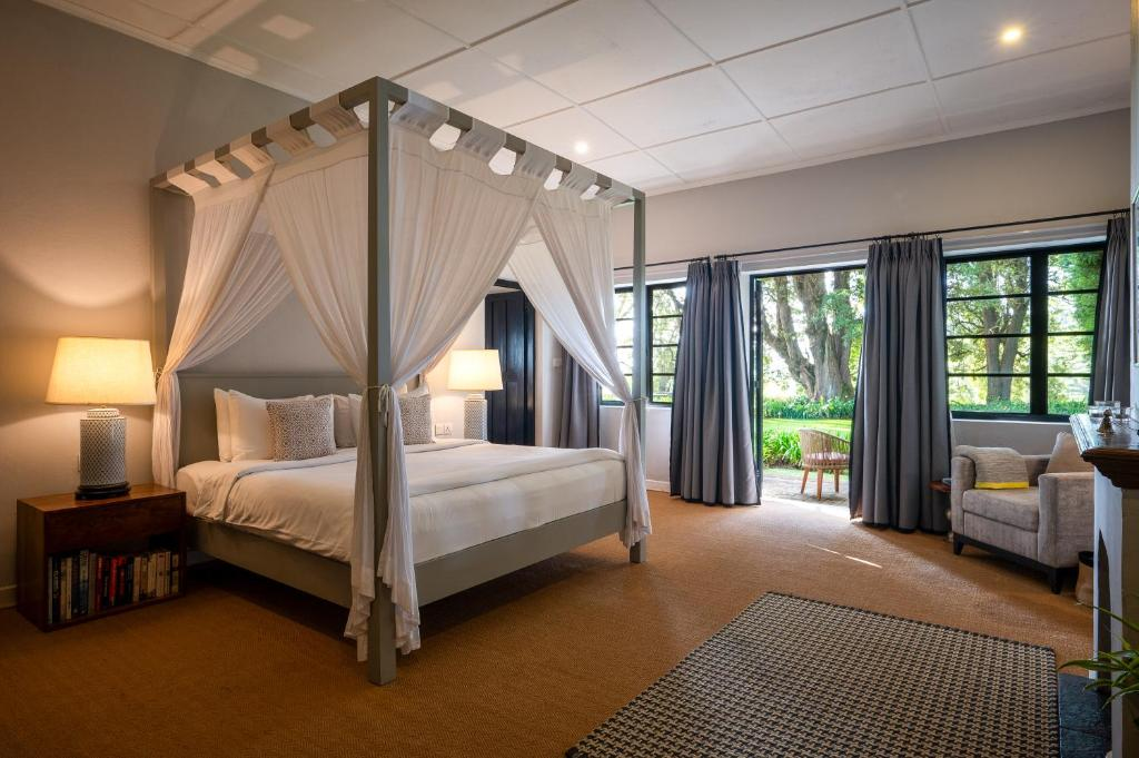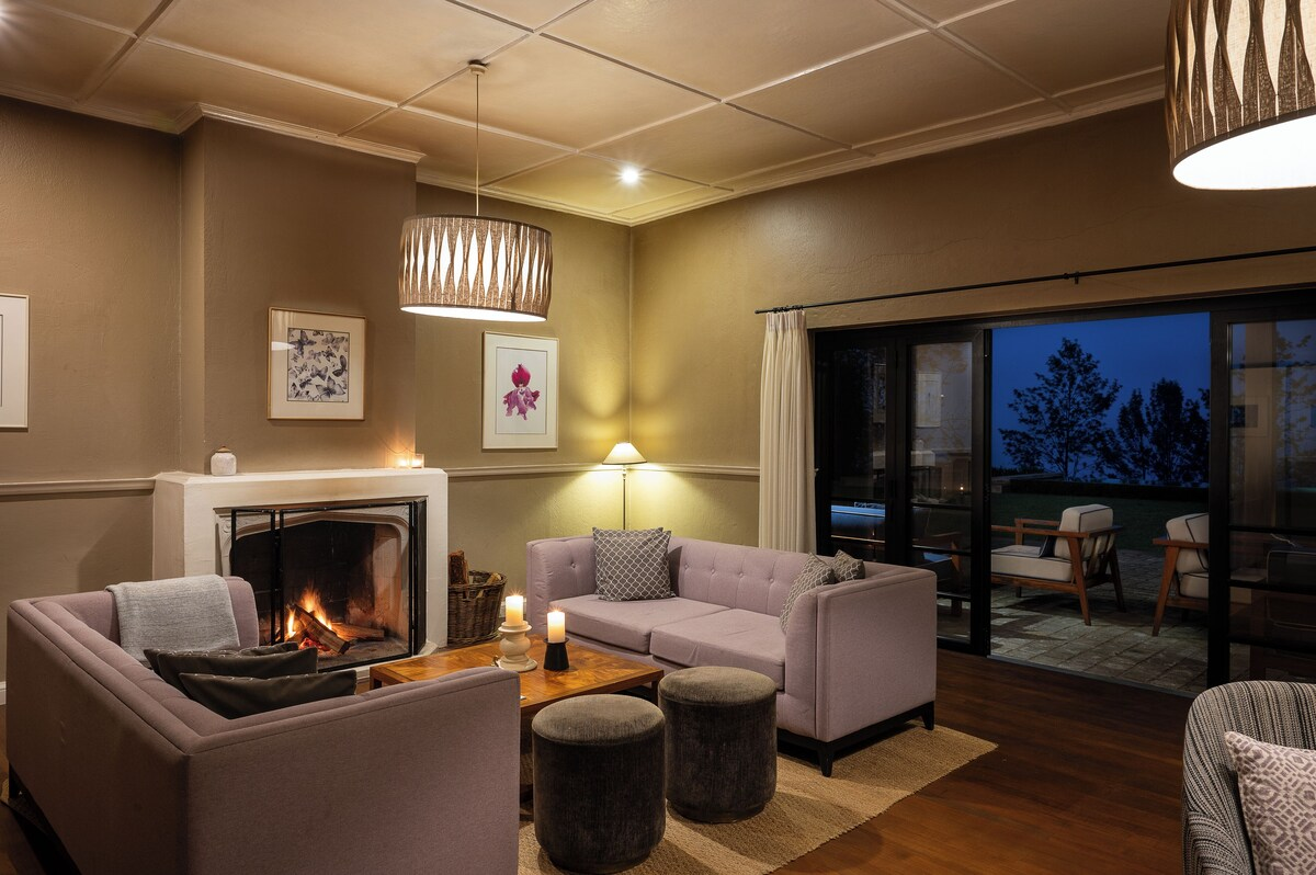 Four rooms and one suite open to views of manicured gardens and distant valleys. Interiors are warm and inviting, with fireplaces, king beds, and soft lighting designed for relaxation. The heated outdoor pool and spacious veranda make the most of the crisp highland air.