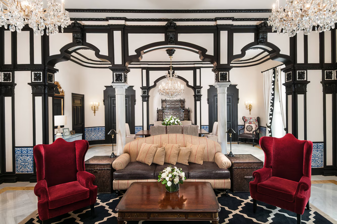Inside, vaulted archways, hand-painted tiles, and wrought-iron chandeliers set the tone for regal hospitality. Each of the 148 rooms and suites is individually styled, some with antique furnishings and private terraces overlooking the hotel’s lush gardens or the city skyline. The central courtyard is a peaceful retreat, surrounded by arched colonnades and fragrant orange trees.