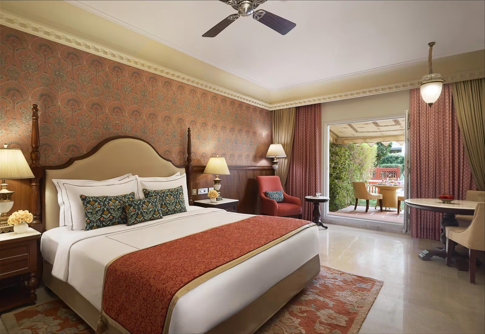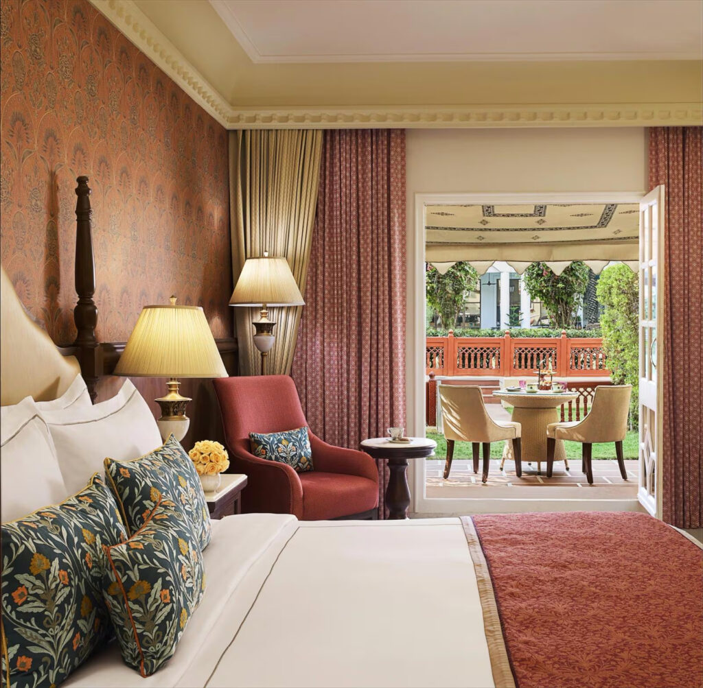 Each guest room is a blend of traditional opulence and modern sophistication, with intricate Rajasthani patterns, rich fabrics, and garden or palace views. The atmosphere feels both stately and welcoming — where attentive service and timeless design create an authentic sense of place. Guests are surrounded by history, yet every modern amenity ensures the highest standard of comfort.