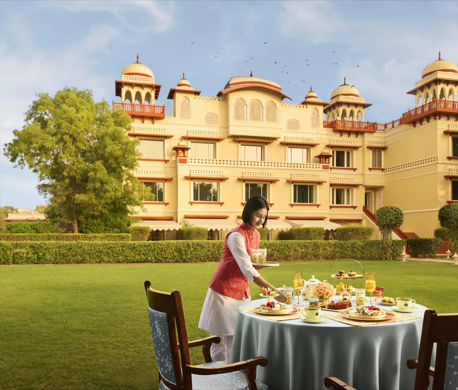 Dining is a highlight at Jai Mahal Palace. Cinnamon serves refined Indian cuisine inspired by royal kitchens, while Giardino offers open-air Italian dining beside the pool. Afternoon tea on the lawn, live traditional music, and curated cultural experiences complete the palace ambiance. Whether wandering through manicured gardens or watching peacocks stroll by at sunset, guests are immersed in Jaipur’s royal charm.