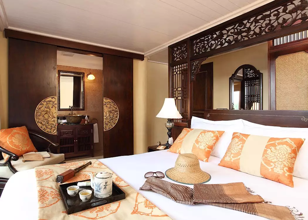 With ornate woodwork, burnished brass, and silk-draped lounges, Jayavarman evokes the romance of early 20th-century Indochina. Inspired by King Jayavarman VII and built in French-colonial style, the ship floats slowly between Cambodia’s rural heartlands and bustling Phnom Penh, creating a strong sense of place on every deck.