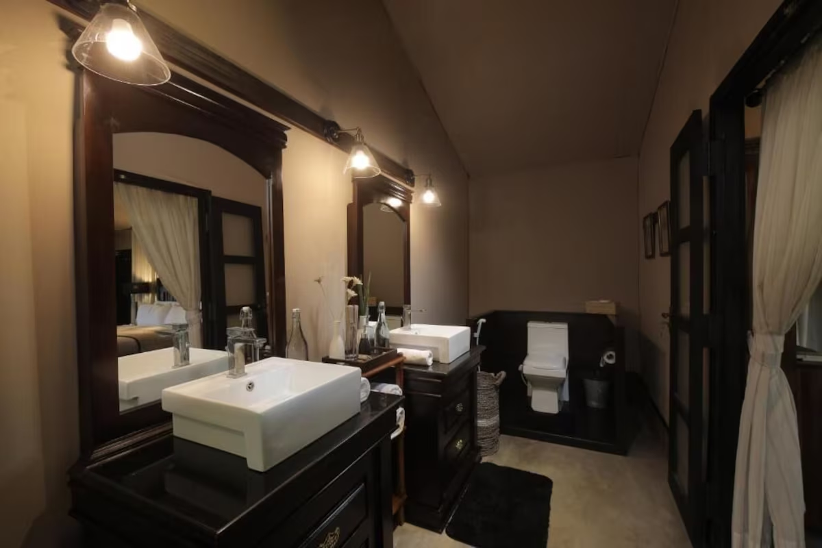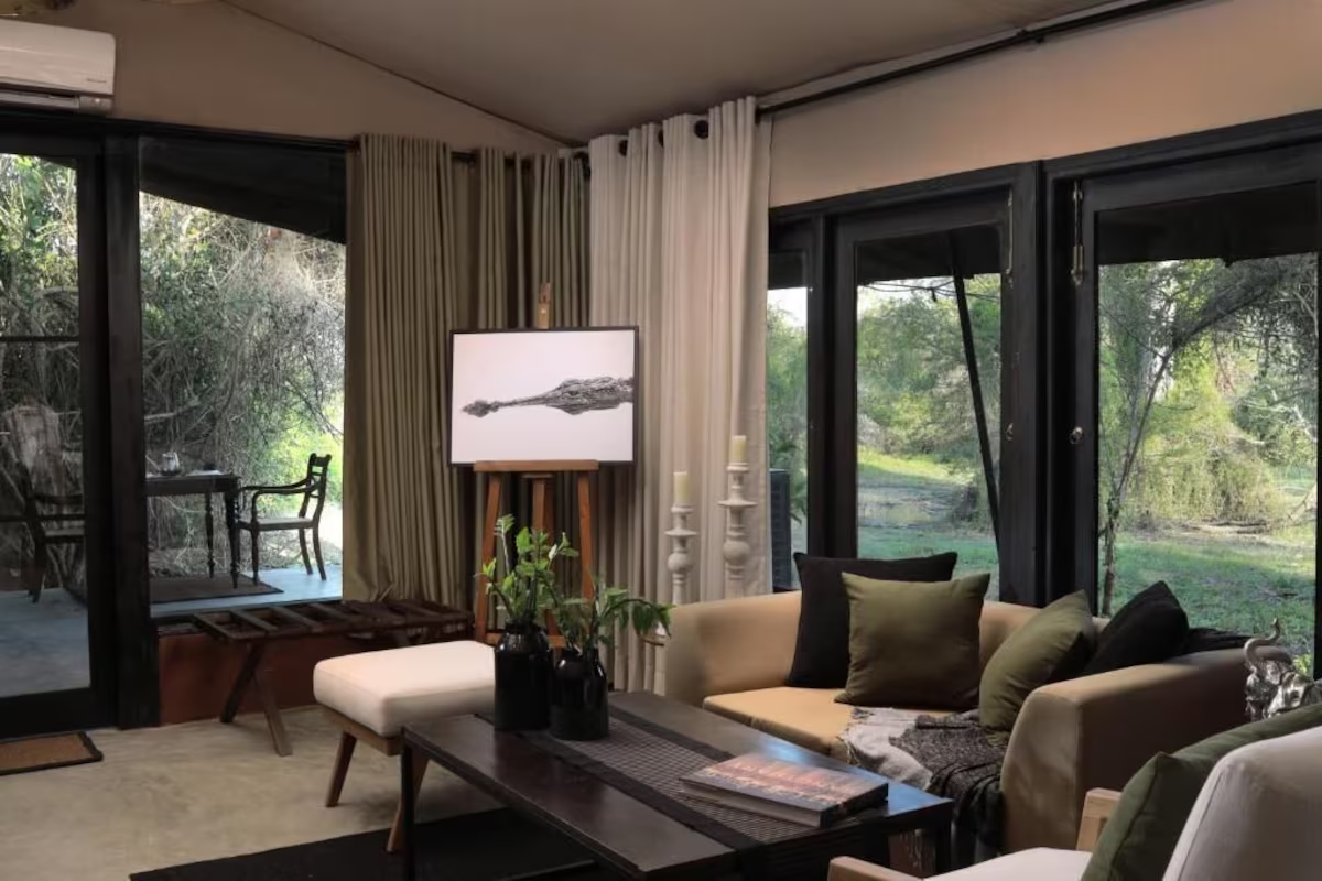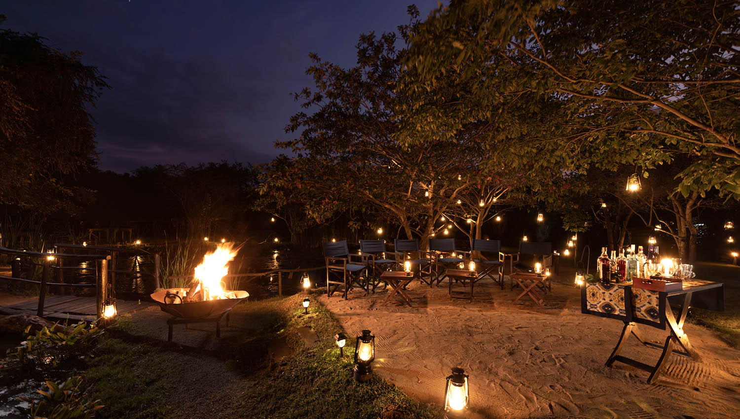 Each luxury tent includes a king bed, private bathroom, and veranda surrounded by forest. The camp maintains a relaxed rhythm – mornings begin with coffee before sunrise safaris, and evenings end with drinks by the fire as stories unfold under clear skies.