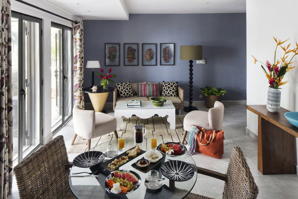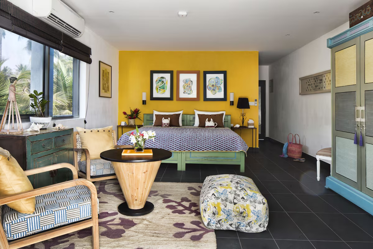 Interiors fuse contemporary with playful charm: vibrant textiles, bold art installations and polished teak vaulted ceilings feel both personalised and effortless. Most suites feature balconies overlooking the sea or garden lounge, while the feel is cosy yet creative – a social coastal escape with heart.