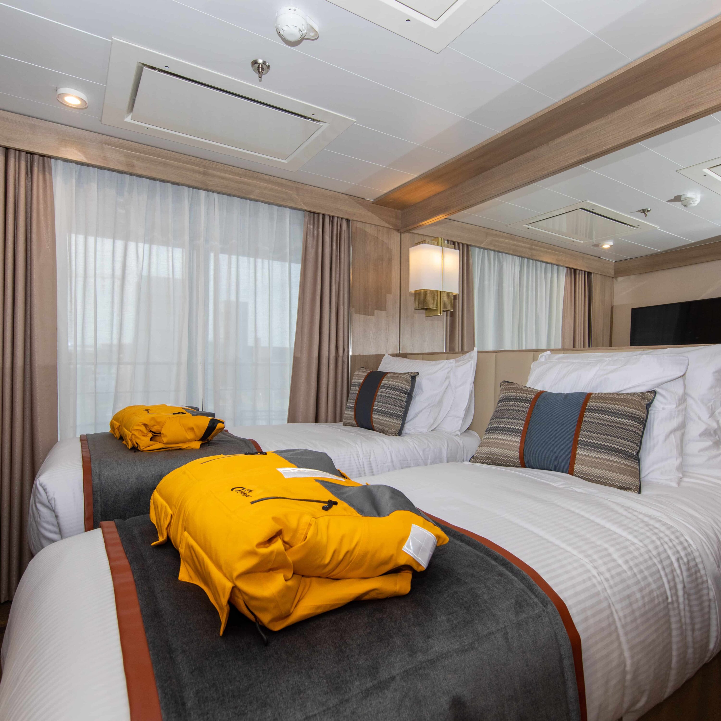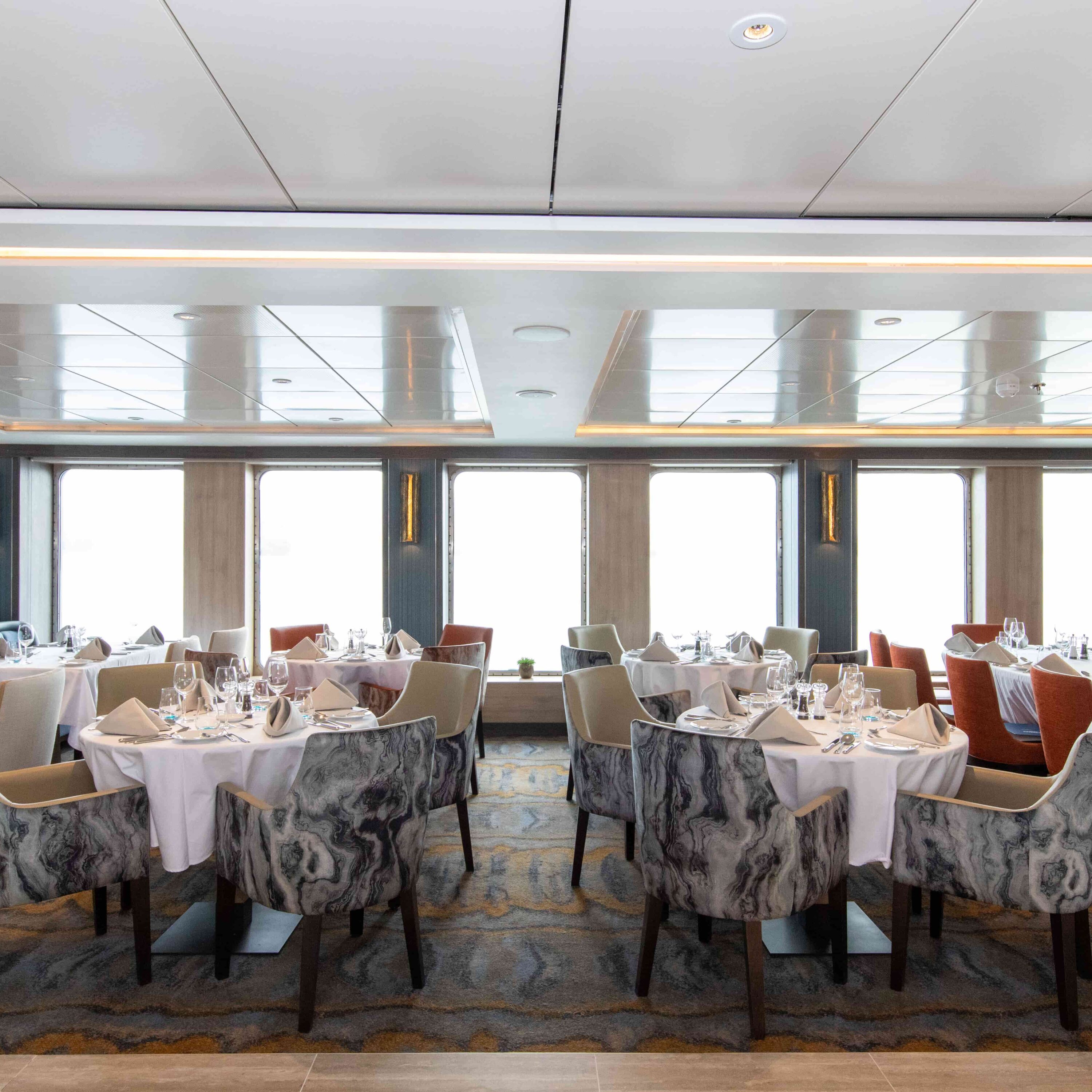 Suites are spacious and all offer ocean views, with many featuring private balconies and separate living areas. The ship includes a heated outdoor pool, two Jacuzzis, a well-equipped fitness centre, and a spa – rare comforts for a polar expedition. The glass-walled Observation Lounge and domed library provide panoramic views of icebergs, wildlife, and open sea.