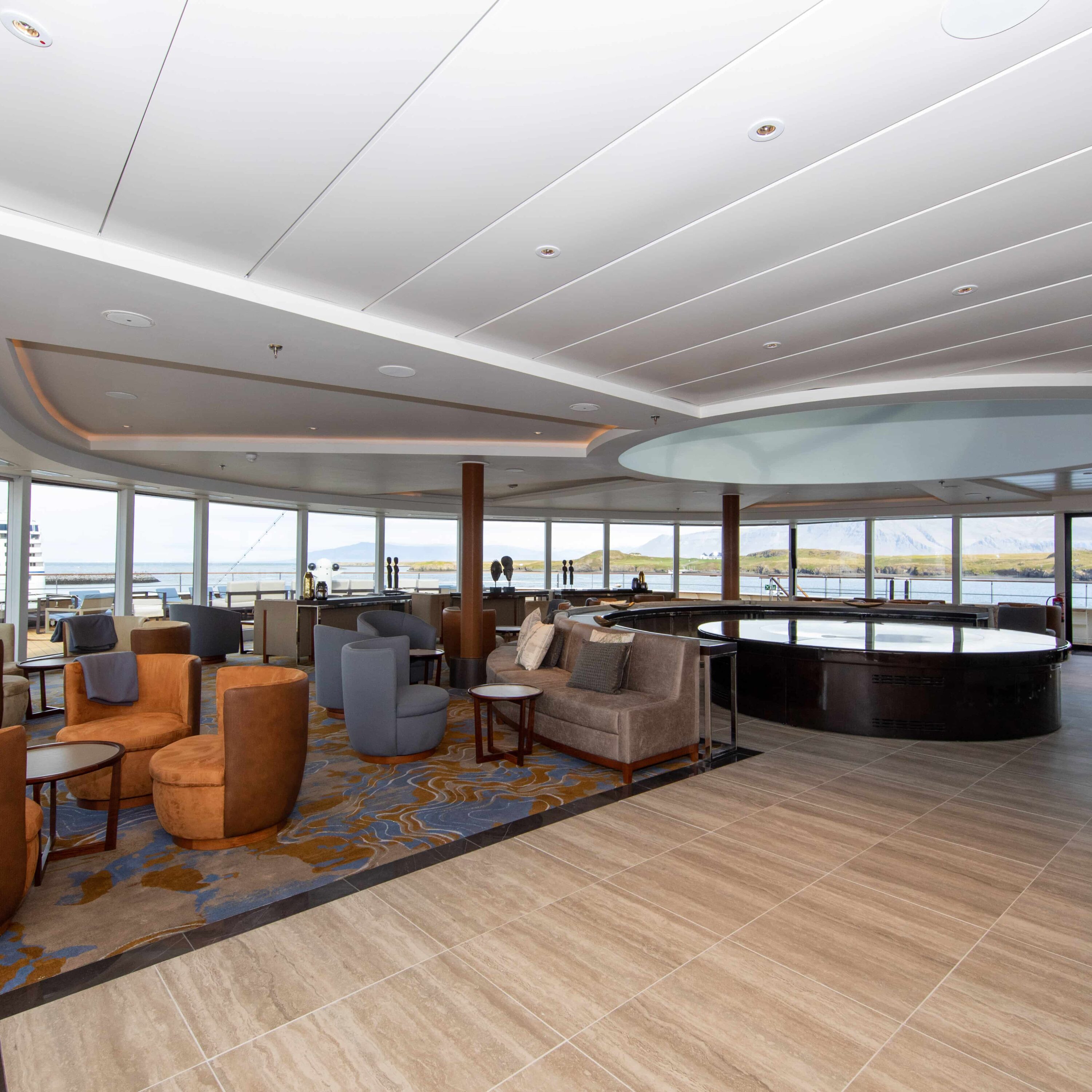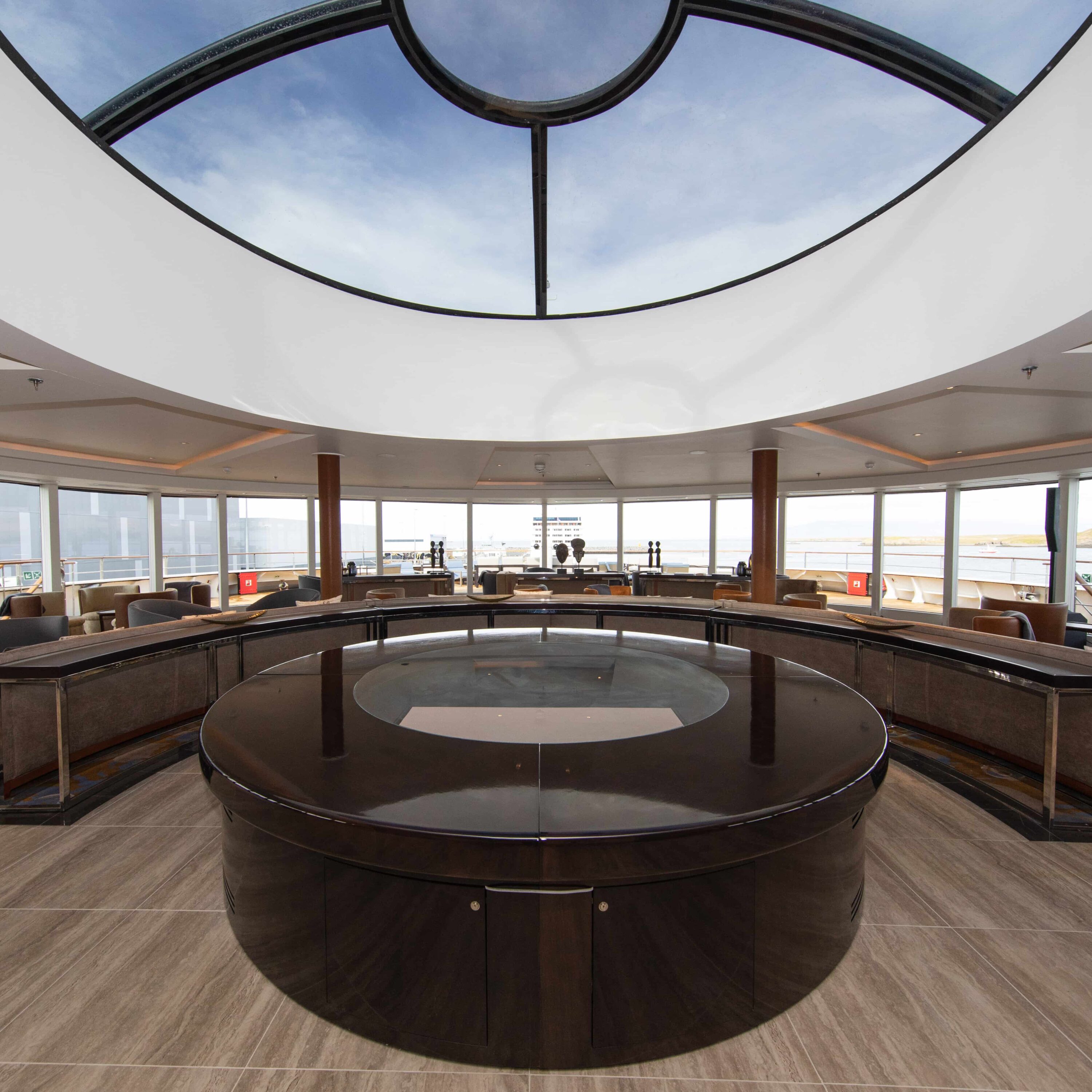 - Panoramic observation lounge and library with floor-to-ceiling glass