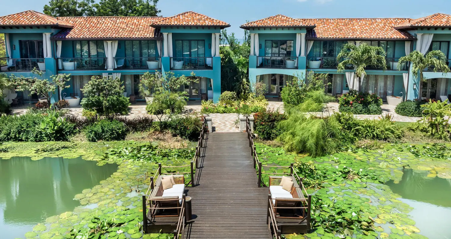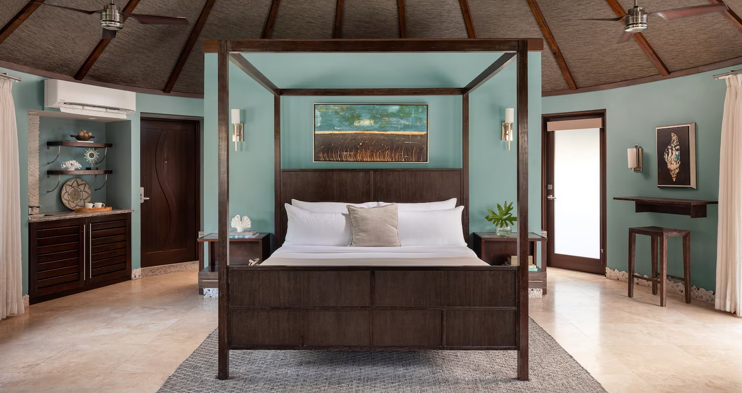 Accommodation options range from oceanfront rooms to some of the brand’s most innovative suites, including Skypool Suites with private infinity-edge plunge pools suspended above the shoreline, and South Seas Rondoval Villas with walled gardens, whirlpools, and butler service. Interiors pair contemporary Caribbean design with luxurious touches, while many suites offer swim-up access or elevated terraces that open directly to sea views.