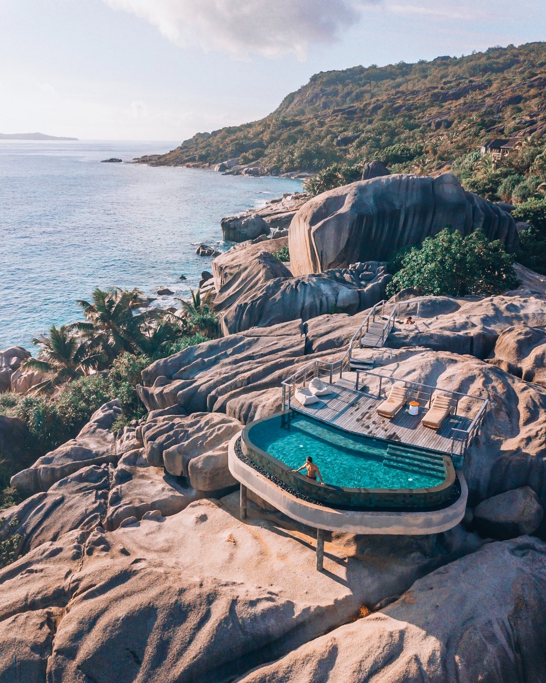 - Five spa pavilions among natural boulders with yoga and serene pools
