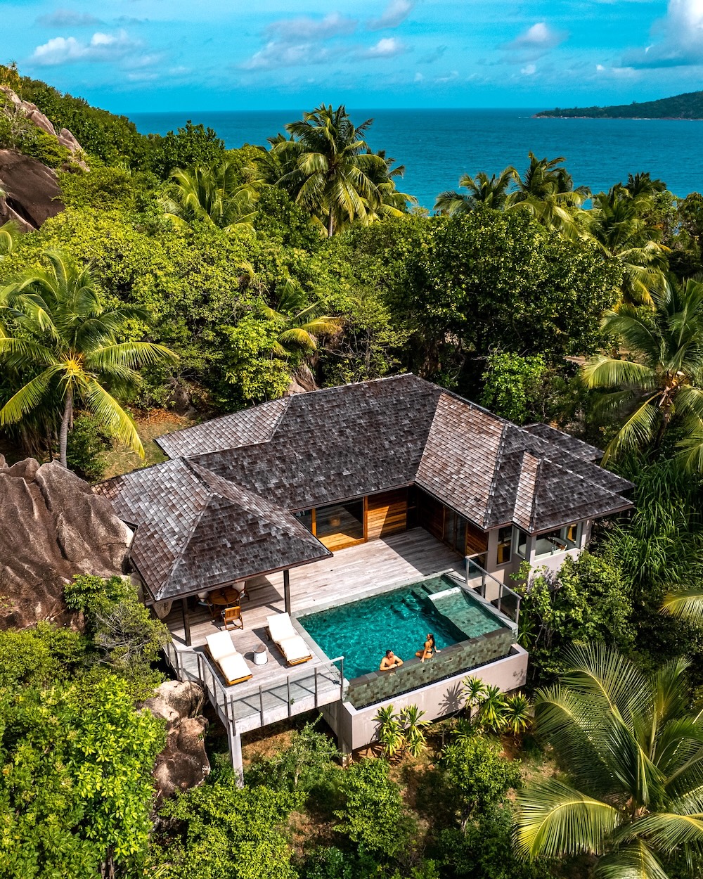 Just 28 one-bedroom and 2 two-bedroom pool villas are nestled between boulder-laced forest and the sea. Each villa has a private infinity-edge pool, vaulted ceilings, indoor-outdoor living spaces and oversized spa-like bathrooms often featuring swing seats over ocean views. Higher villas – like Panorama suites – offer elevated sea panoramas and spacious decks.