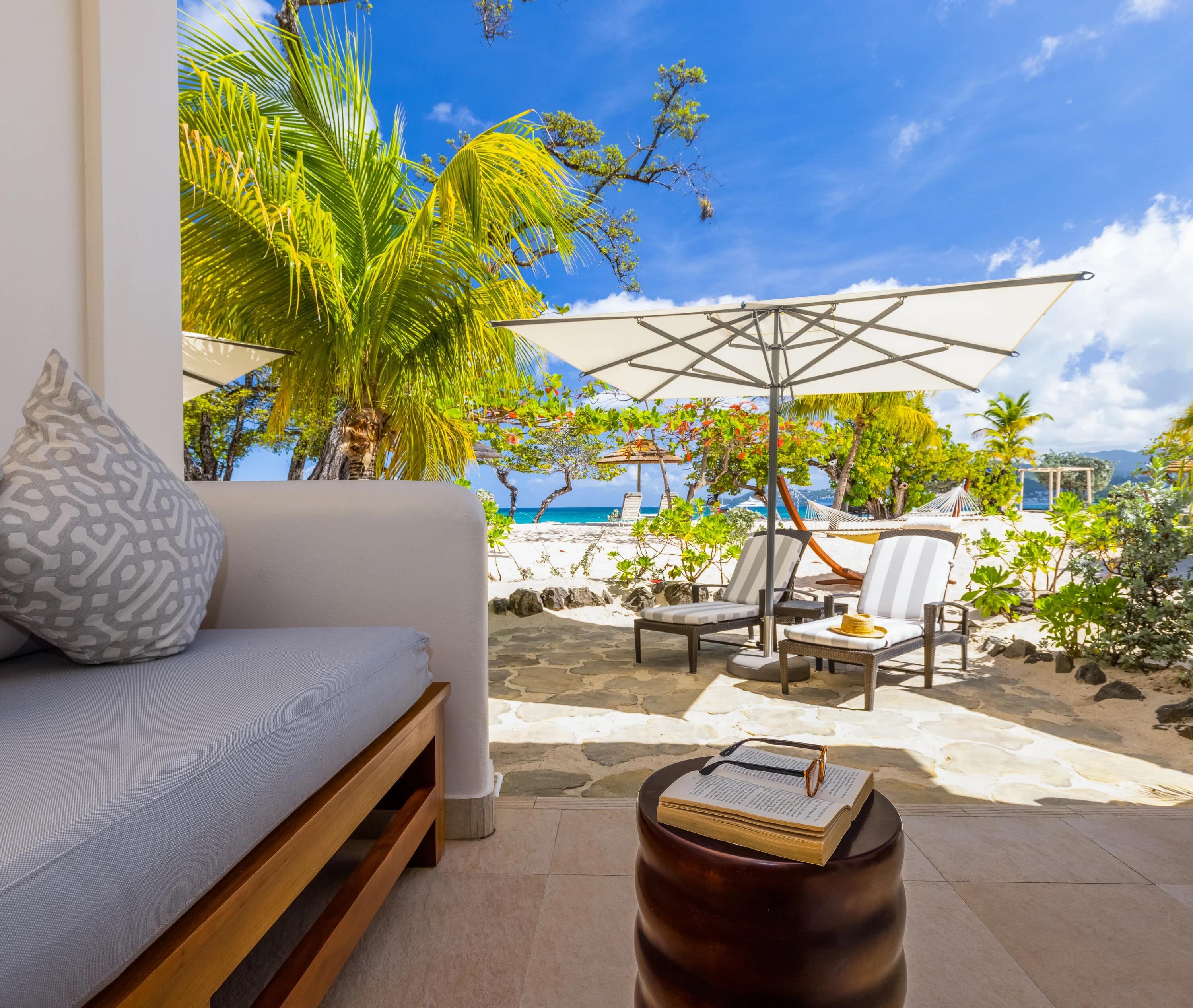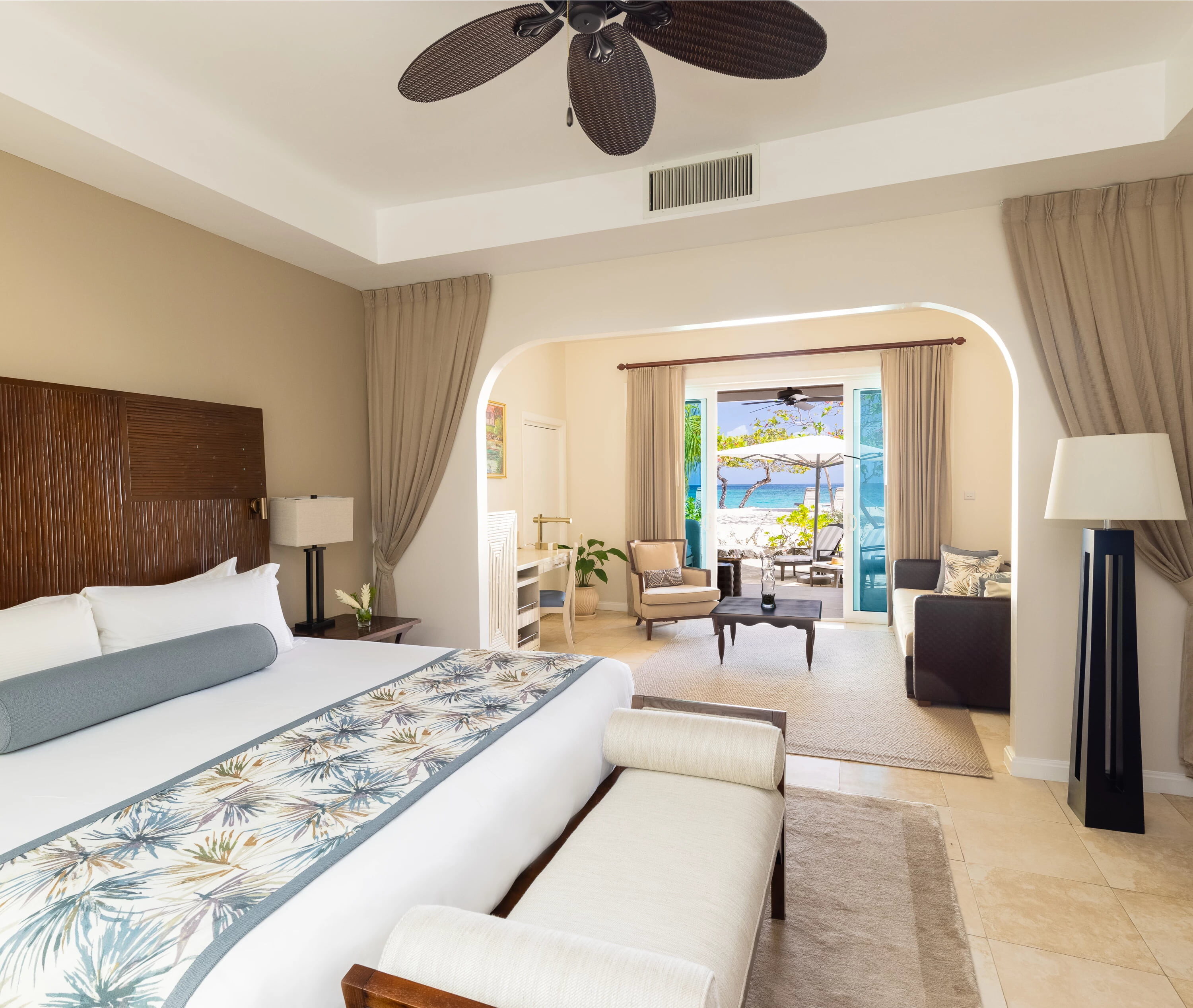 The property features 64 spacious suites set in beachfront or lush garden locations. Options range from Seagrape Beach Suites with double hammocks to Almond and Royal Collection Pool Suites, each offering generous private pools or outdoor cedar saunas. Interiors combine bold fabrics, rich wood finishes, and breezy open-plan living.
