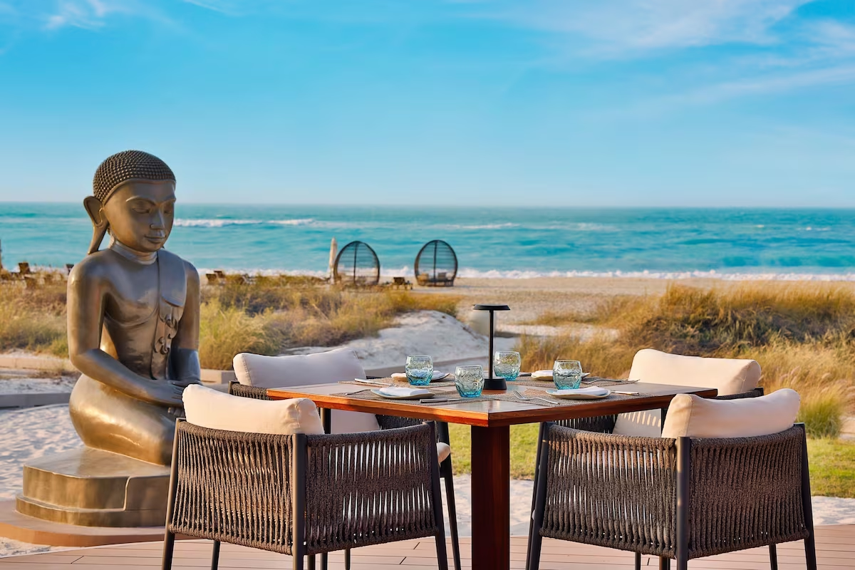 Dining is a standout, with six refined venues including Buddha-Bar Beach, the signature Sontaya restaurant floating over lily ponds, and a sophisticated grill house offering steak and seafood with a view. The Iridium Spa spans over 3,500 square metres with 12 treatment rooms, plunge pools and saunas, while the resort’s three outdoor pools, indoor lap pool, tennis courts, and beach cabanas offer layers of leisure. Families are welcomed with a thoughtfully curated kids’ club, while golfers enjoy direct access to Saadiyat Beach Golf Club – a par-72 course framed by sea views and rolling dunes.