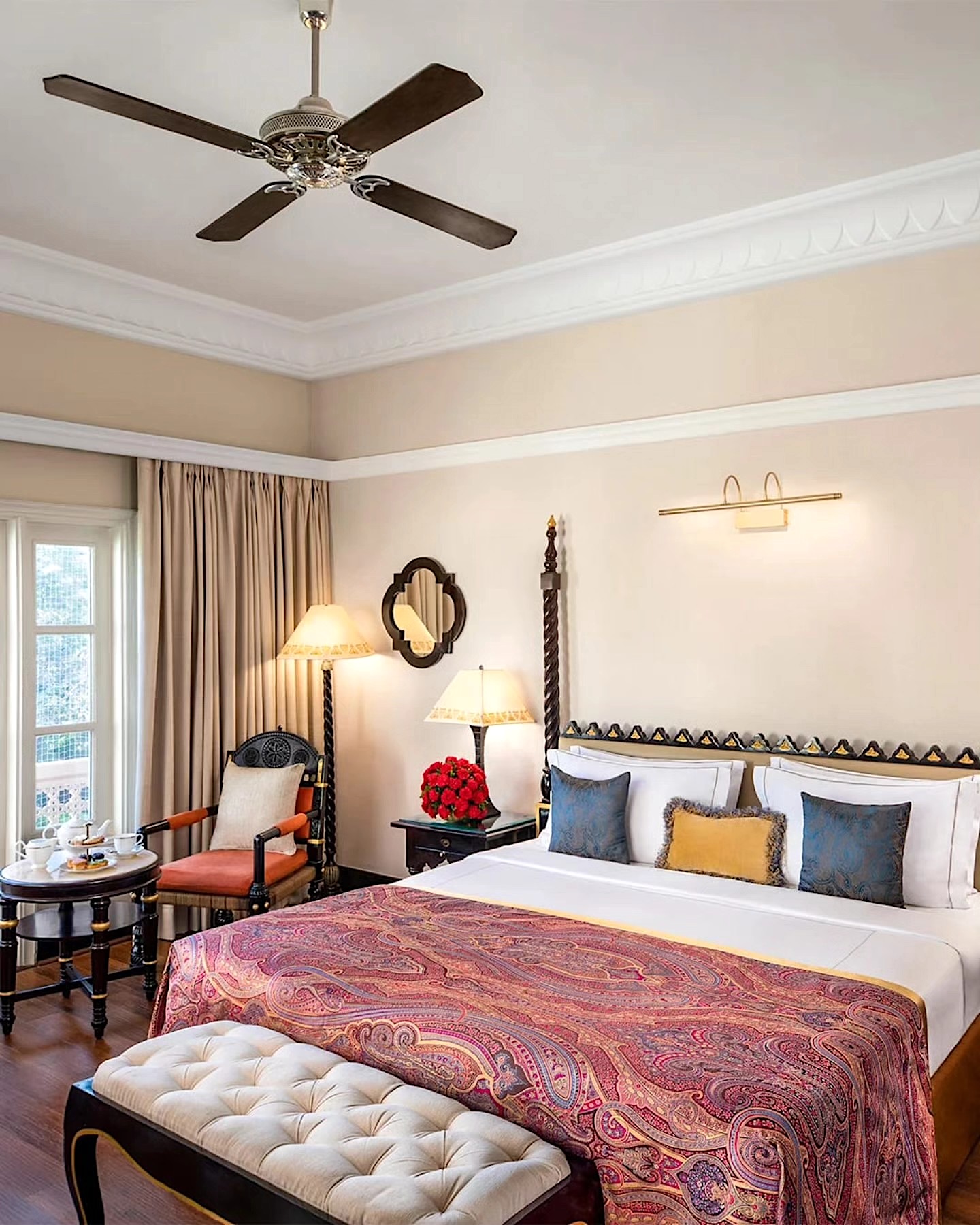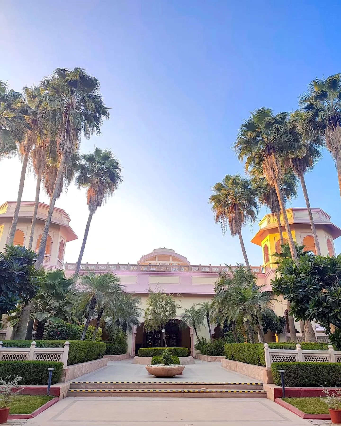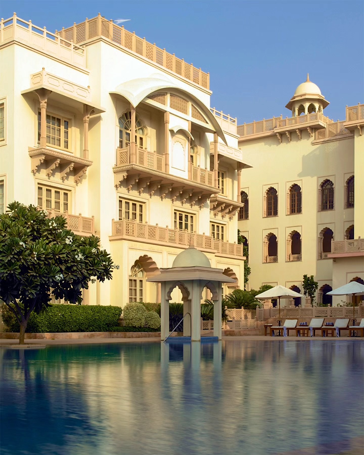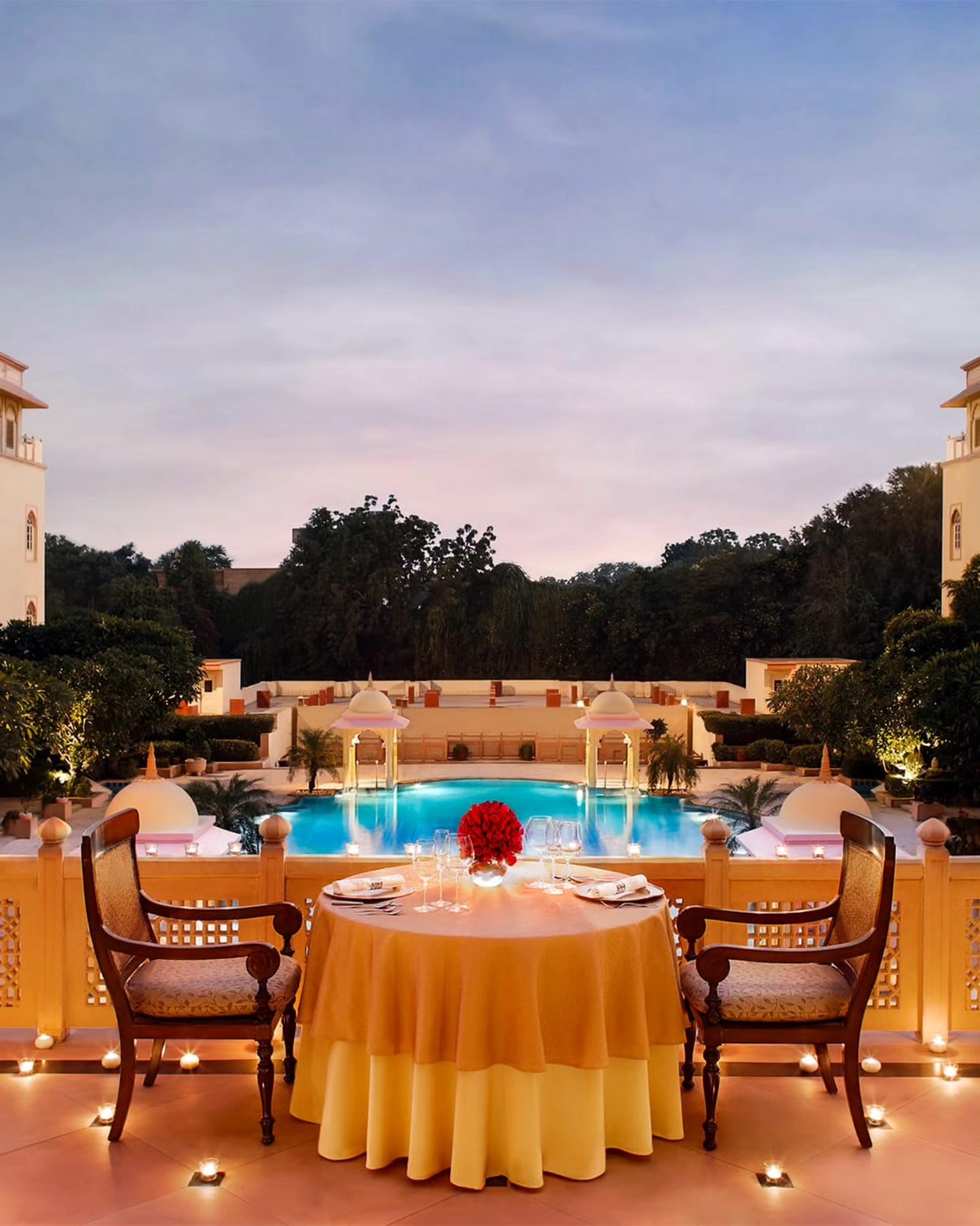 Rooms and suites are spacious and refined, many with views across the gardens, pool and city skyline. Ornate headboards, brass details and plush fabrics introduce modern comfort without losing the hotel’s distinguished heritage feel. A large outdoor pool shaded by palm trees offers an inviting escape from the desert sun, while the Jiva Spa delivers ancient wellness traditions rooted in Ayurveda.