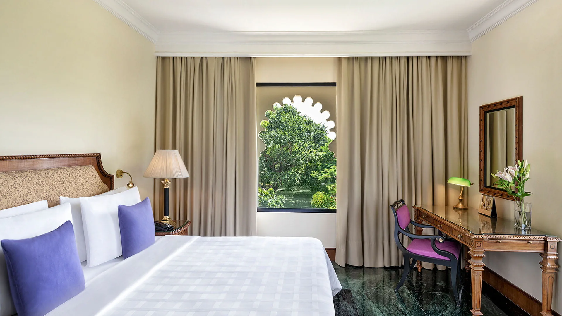 Set along the banks of Lake Pichola with views towards the Aravalli hills, Trident Udaipur offers a calm and elegant retreat just ten minutes from the heart of the city. Inspired by the palatial architecture of Rajasthan, its colonnaded walkways, ornamental arches and serene courtyards create a refined and welcoming atmosphere. Beautifully maintained gardens lead to a large outdoor pool shaded by mature trees – a peaceful space to unwind after exploring Udaipur’s landmarks.