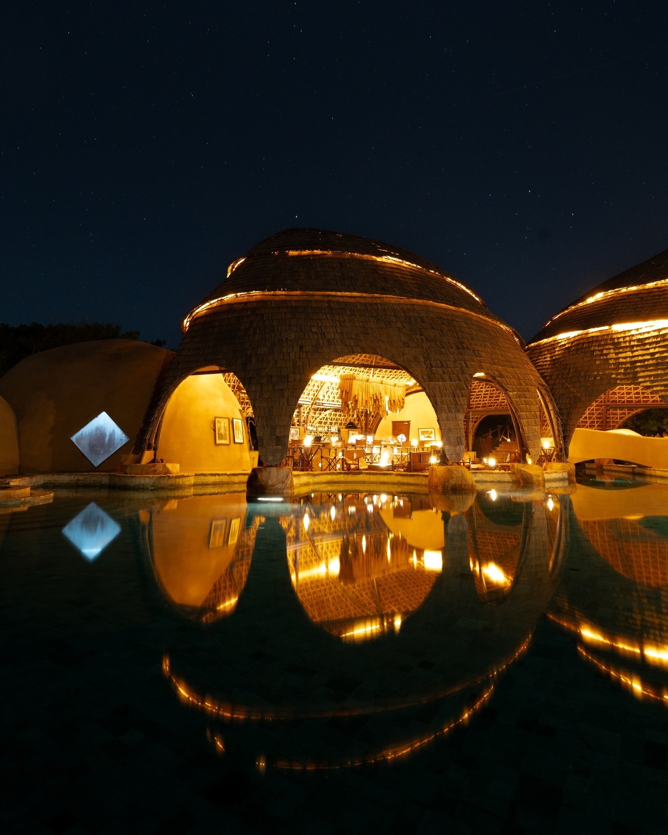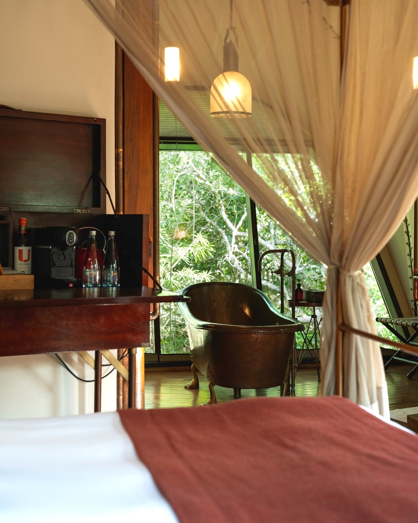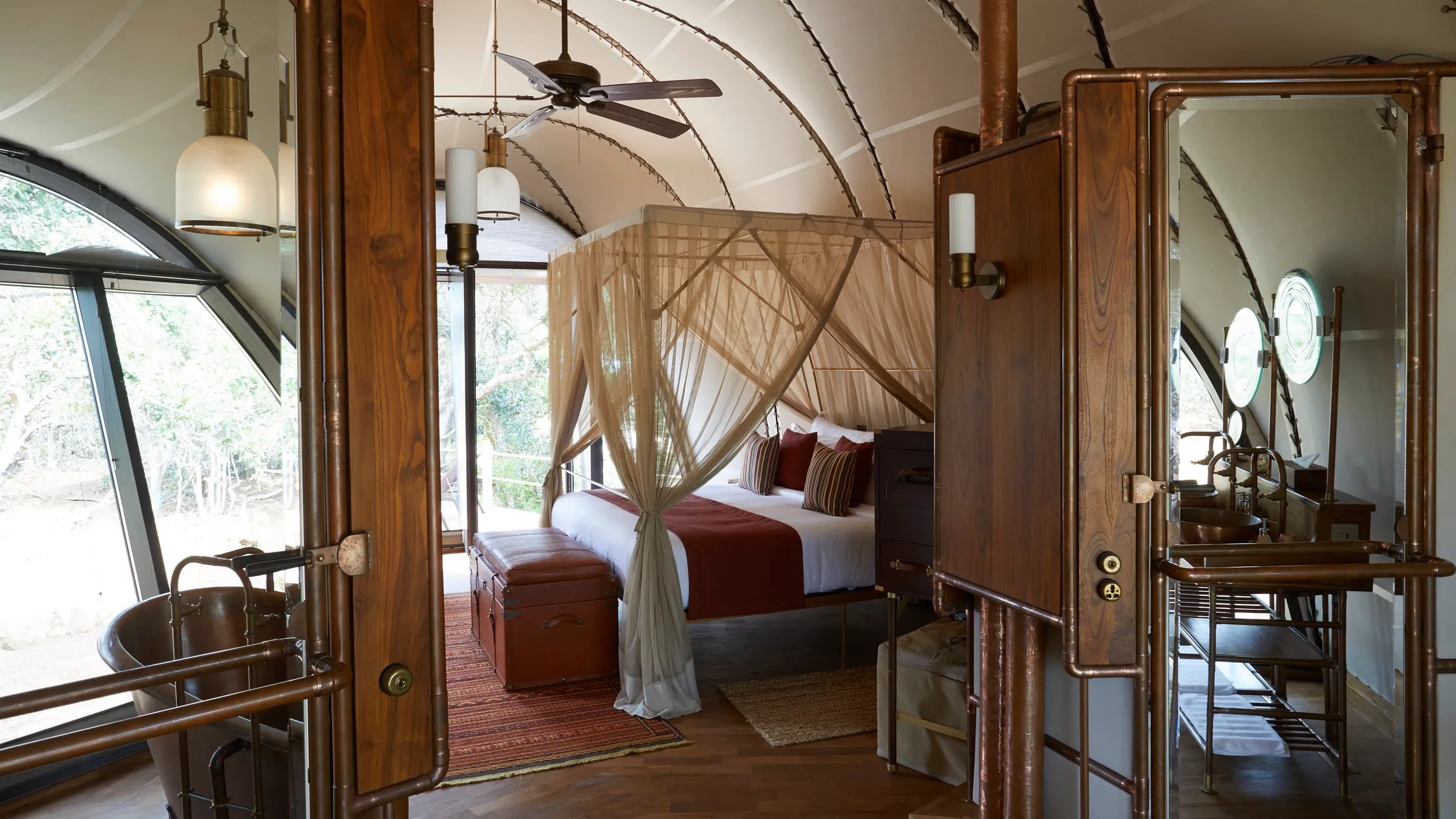 Inside each cocoon, polished copper bathtubs, four-poster beds and natural textures create a sophisticated safari retreat, complemented by private plunge pools in selected suites. Floor-to-ceiling glass allows uninterrupted views of the bush, making every moment feel close to nature without compromising comfort.
